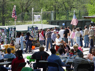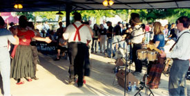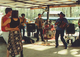 | Roslyn and Roger dance to one of our favorite groups, Thomas Fields and His Foot-Stompin' Zydeco Band. In the background, members of a local organization get ready for a boat ride. |
