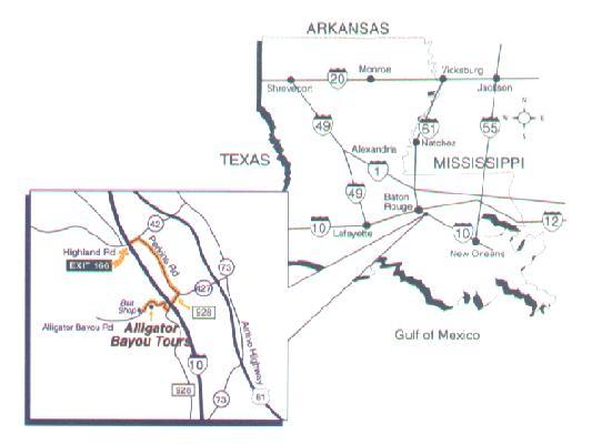 Driving directions: From Baton Rouge and New Orleans, take I-10 to Exit 166 at Highland Road. Travel east (left from Baton Rouge, right from New Orleans) on Highland Road (La. Hwy. 42) and turn right on Old Perkins Road. Turn right again at La. Hwy. 928. Immediately after crossing over I-10, turn right on Alligator Bayou Road. See us on the left about a mile after the road becomes gravel.